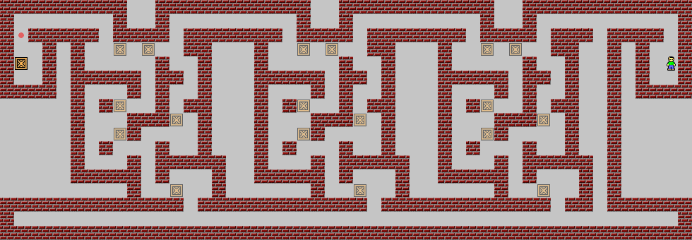 这是 Aymeric du Peloux 2001年设计的 Picokosmos 第17关。David Holland 在2002年曾分析过这个关卡。Dries De Clercq 在这个基础上作了名为 Fibo 系列的变形关卡。上图所示的经典形式不只是一个关卡,而是一系列关卡,关卡可以纵向任意伸长(同时箱子也增加),只要保持箱子总数是偶数个就行了(奇数的时候关卡无解)。若用n表示箱子的数目,随着n增大,答案步数以n的指数函数增长。